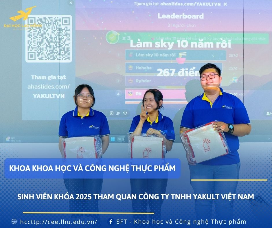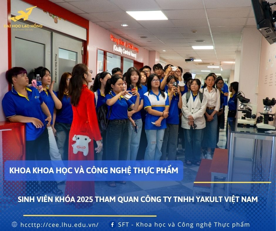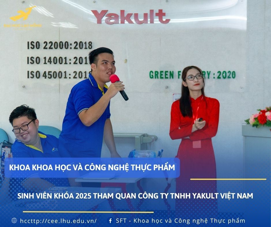 Ngày 22/10/2025 các tân sinh viên Khoa Khoa học và Công nghệ Thực phẩm tham quan Công ty TNHH Yakult Việt Nam, một trong những doanh nghiệp hàng đầu trong lĩnh vực sản xuất sữa chua lên men. Chuyến đi là cơ hội quý báu để sinh viên được tiếp cận, học hỏi và quan sát tận mắt môi trường làm việc chuyên nghiệp cũng như quy trình sản xuất hiện đại.