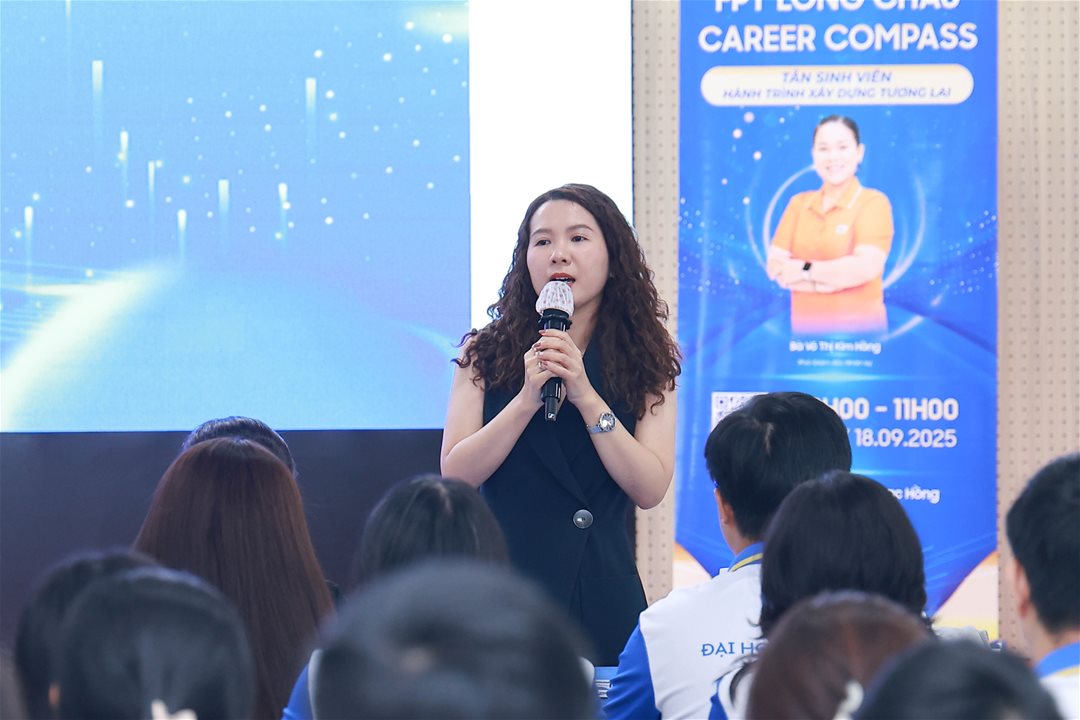 Đại diện FPT Long Châu Bà Võ Thị Kim Hồng – Phó Giám đốc Nhân sự đã chia sẻ nhiều câu chuyện thực tiễn xoay quanh cơ hội nghề nghiệp trong ngành dược, xu hướng phát triển của lĩnh vực này, đồng thời cung cấp những kinh nghiệm hữu ích giúp sinh viên định hướng lộ trình nghề nghiệp ngay từ năm đầu đại học.