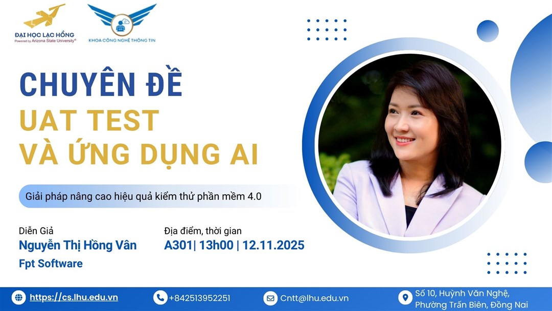 Chiều ngày 12/11/2025, Khoa Công nghệ Thông tin – Trường Đại học Lạc Hồng đã tổ chức buổi chuyên đề “UAT Test & Ứng dụng AI” dành cho sinh viên các khóa, với sự đồng hành của cô Nguyễn Thị Hồng Vân – chuyên gia đến từ FPT Software HCM.
