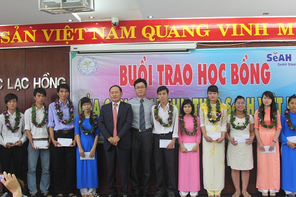 The scholarship awarding ceremony was organized at Room B 203 – Campus 1 – Lac Hong University with the attendance of the Chief of the Dong Nai province’s Department of Education and Training Phan Dinh Chuong, Vice rectors of Lac Hong University Dr. Diep Cam Thu, Dr. Nguyen Van Nam and Lam Thanh Hien, M.A, Director of Enterprise Relations and Student Support center Tran Dung, M.A, General Manager of SeAH Steel Vina Corp. Nam Hyung Kun and Deputy General Manager Park Sang Yong.