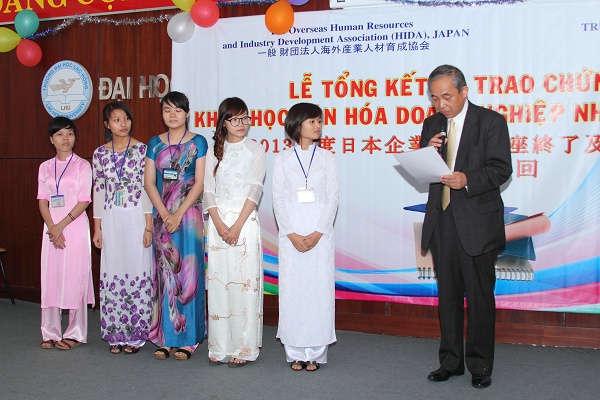 Recently, Lac Hong University in cooperation with HIDA (The Overseas Human Resources and Industry Development Association, Japan) held a ceremony to close Japanese Business Culture Course and grant certificates of completion to 65 senior students of Japanese Studies. The program took place at room B 203 with the participation of Management consultant Mr. Takeda Sadao; Management consultant and lecturer of Japanese Corporate culture Mr. Masayuki Matsumura; LHU's Vice Rector and Head of Academic Affairs Department Lam Thanh Hien, MSc.; Vice Dean of Oriental Studies Nguyen Huu Nghi; Head of Japanese Studies branch Nguyen Thi Nhu Thuong, M.A.