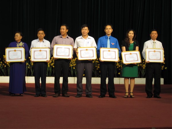 Secretary of Lac Hong University Youth Union Le Son Quang (third from the right) received certificate of merit from provincial People's Committee.