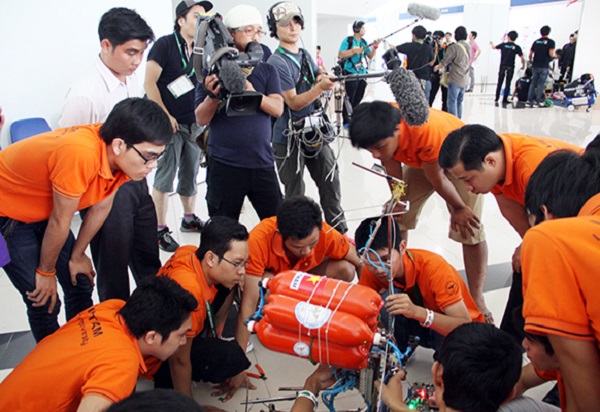 NHK reporter is recording robot of Lac Hong University at 2013 Asia-Pacific Robot Contest.