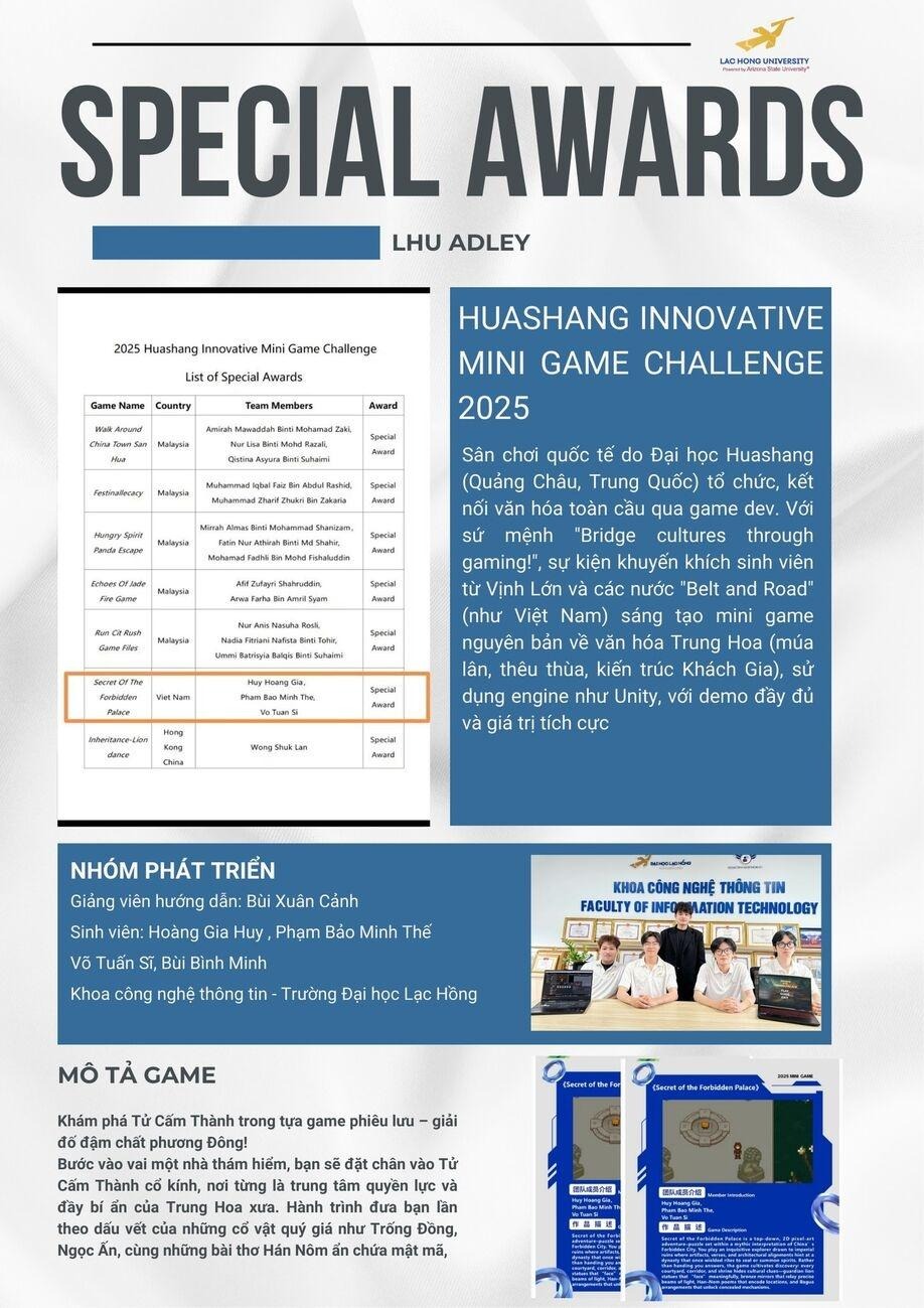 On September 25, 2025, Lac Hong University (LHU) once again affirmed its regional and international standing as Team LHU Adley from the Faculty of Information Technology proudly won the Special Award at the Huashang Innovative Mini Game Challenge 2025, organized by Huashang College, Guangzhou, China.